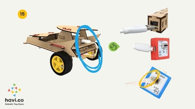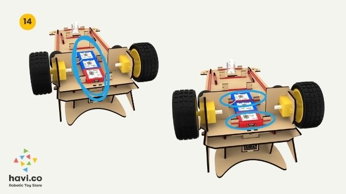 On the bottom of the car, between the ends of Elements’ lock plates, place the circuit. Fix the circuit with rubber bands(Mark the cut given on elements’ lock plates for rubber bands).